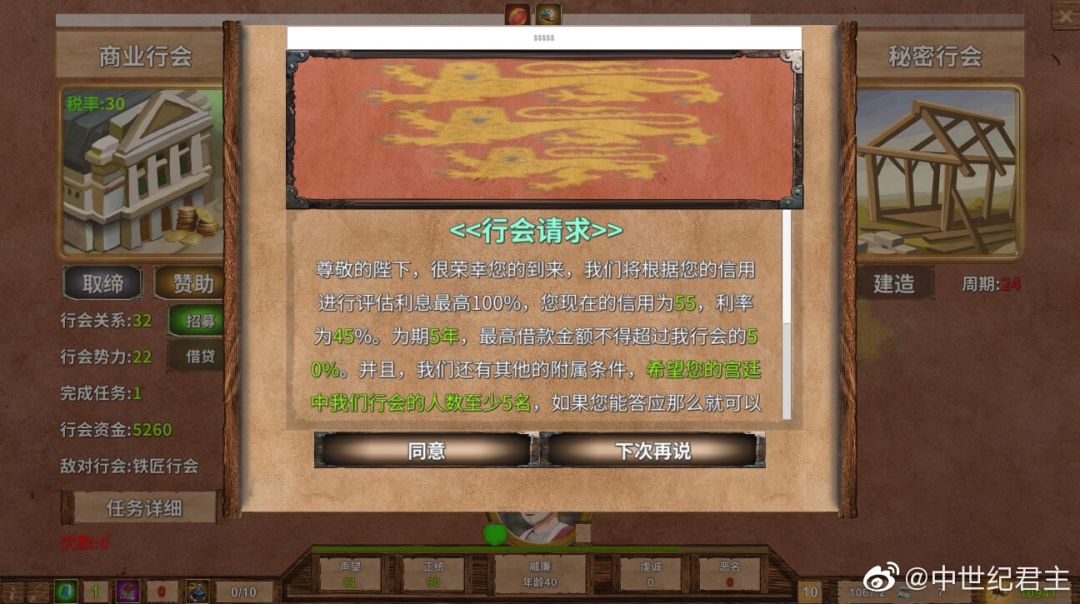 行会不仅会发放一些任务,玩家作为统治者也可以请求行会的帮助,商业行会一般为借贷,工匠为增加封地建设的进度,炼金可以买药或者治病等,以后还会更新更多的请求功能,暂时不是太多。