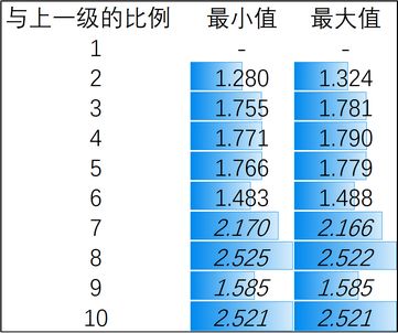 ① 本表将某一级别所有位置神语的属性加成与上一级相同位置相同属性加成求比,之后取其中的最大值与最小值。