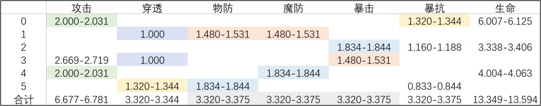 ③ 表中将所有数值完全一致的属性加成标为了相同的颜色,例如1号位物防加成、1号位魔防加成以及3号位暴击加成永远一致。