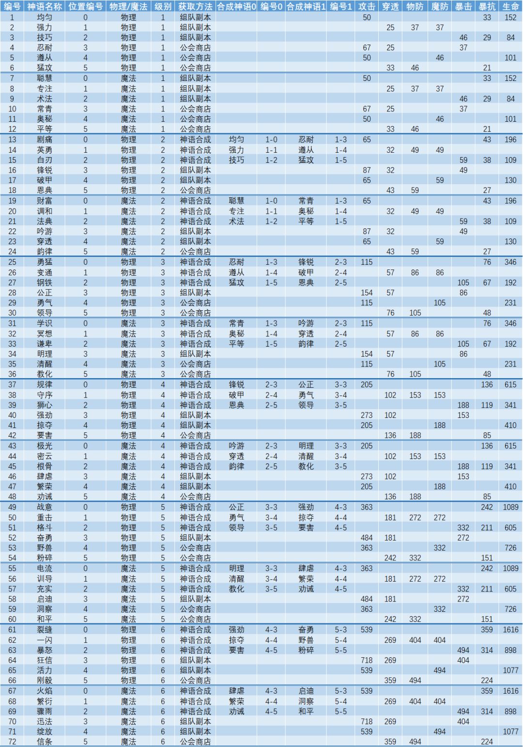 ② 篇幅原因,没有具体列出每一级神语的比例关系(列出来也不会有人看的),表中数据均为1~6级对应神语对应属性的比例范围。