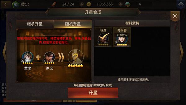 武将养成的另一个核心是武将升星,武将吞噬材料武将获取晋级经验值,当晋级经验值满后可以进行晋级。吞噬同类武将晋级时,星级提升的同时保留原武将的等级和装备。吞噬其他武将晋级时,将随机出现一个高一星的武将,新出现武将等级和装备回到原始水平。