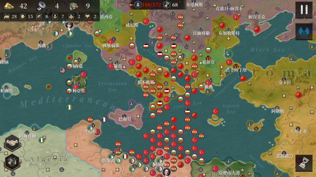 在160回合后完成了对德奥两国的基本吞并,主力攻向巴尔干半岛,次路攻向苏联,最终在174回合取得了胜利。