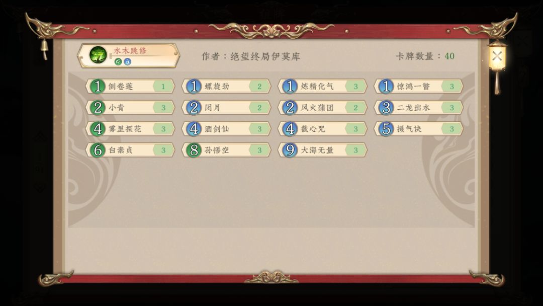 用女儿国门派特殊胜利。极其克制在前期没有进攻性的卡组,打生灵套主要靠七宝玲珑塔。