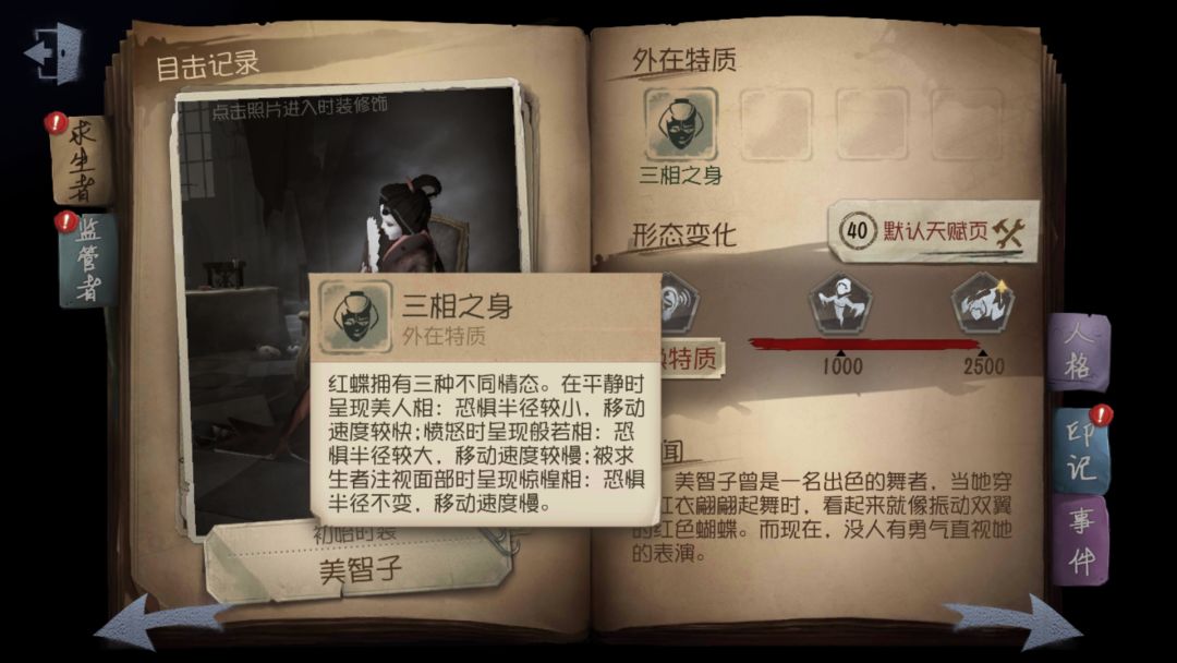 虽然红蝶的技能很强势,但全服第一短手也不是白叫的,蓄力大概和厂长的平a有的一拼,并且当求生者面对她时会红蝶会获得减速debuff,并且离魄移魂技能无法释放,所以这也是一个有得必有失的监管者,找好反制方法是一个非常好针对的监管者