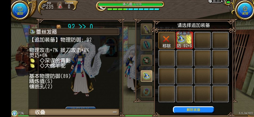蕾丝发箍有着7%物理攻击和6%灵巧,可以说对奥义流拔刀物理攻击面板提升极大!而且那8%拔刀伤害在奥义流拔刀的玩法里也算很有用的属性了。至于帽子王石嘛,选择深谋的青影和大绵羊驼。深谋的青影有8%拔刀伤害、8%近距离伤害提升,大绵羊驼有6%近距离伤害提升,这是奥义流拔刀最喜欢的伤害加成属性。除此之外,大绵羊驼的300MP亦对奥义流拔刀的机体构成起到了重要作用。