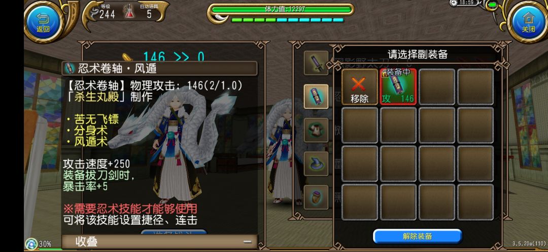风遁卷轴提供250攻击速度和5点暴击率,是最适合拔刀的忍术卷轴了,没有之一!在卷轴属性上,我们对物理攻击数值没有要求,因为卷轴物理攻击不会提高角色的物理攻击。但是MP节省效果要求至少为“2”,咏唱缩时效果要求至少为“0.5”。嗯,我装备的这个卷轴属性为(2/1.0),算是目前使用性能上表现最佳的风遁卷轴了。最后一点,卷轴技能要求为苦无飞镖+风遁术+分身术这三个忍术。