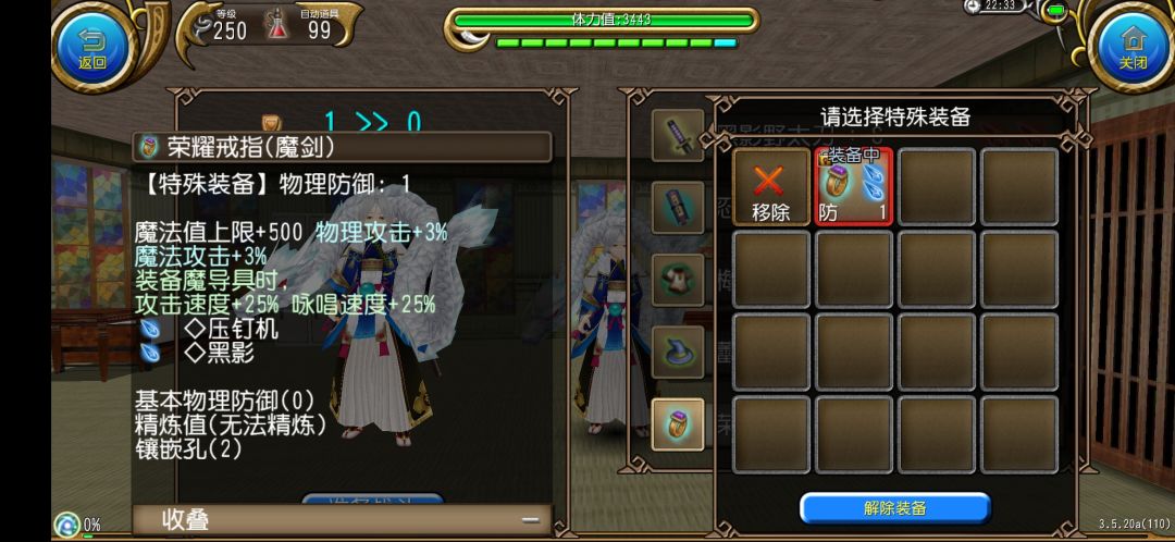 荣耀戒指的属性实在是非常优秀!除了500MP外,它还加3%物理攻击。戒指王石的话我选择黑影和压钉机。黑影能提高8%物理攻击,这提升对追求高物理攻击面板的奥义流拔刀来说太香啦!除此之外,黑影的3点攻击魔法回复亦是对奥义流有不错收益的属性。(虽然黑影会减少角色150MP上限,但3点攻回的提升显然是大于150MP的。)至于压钉机的12%拔刀伤害加成,放眼整个游戏无出其右者,而且它之后还有强化王石,玩拔刀少不了它。