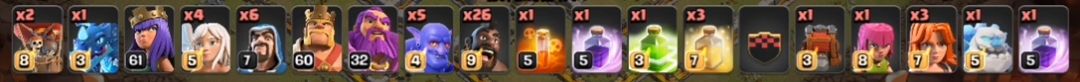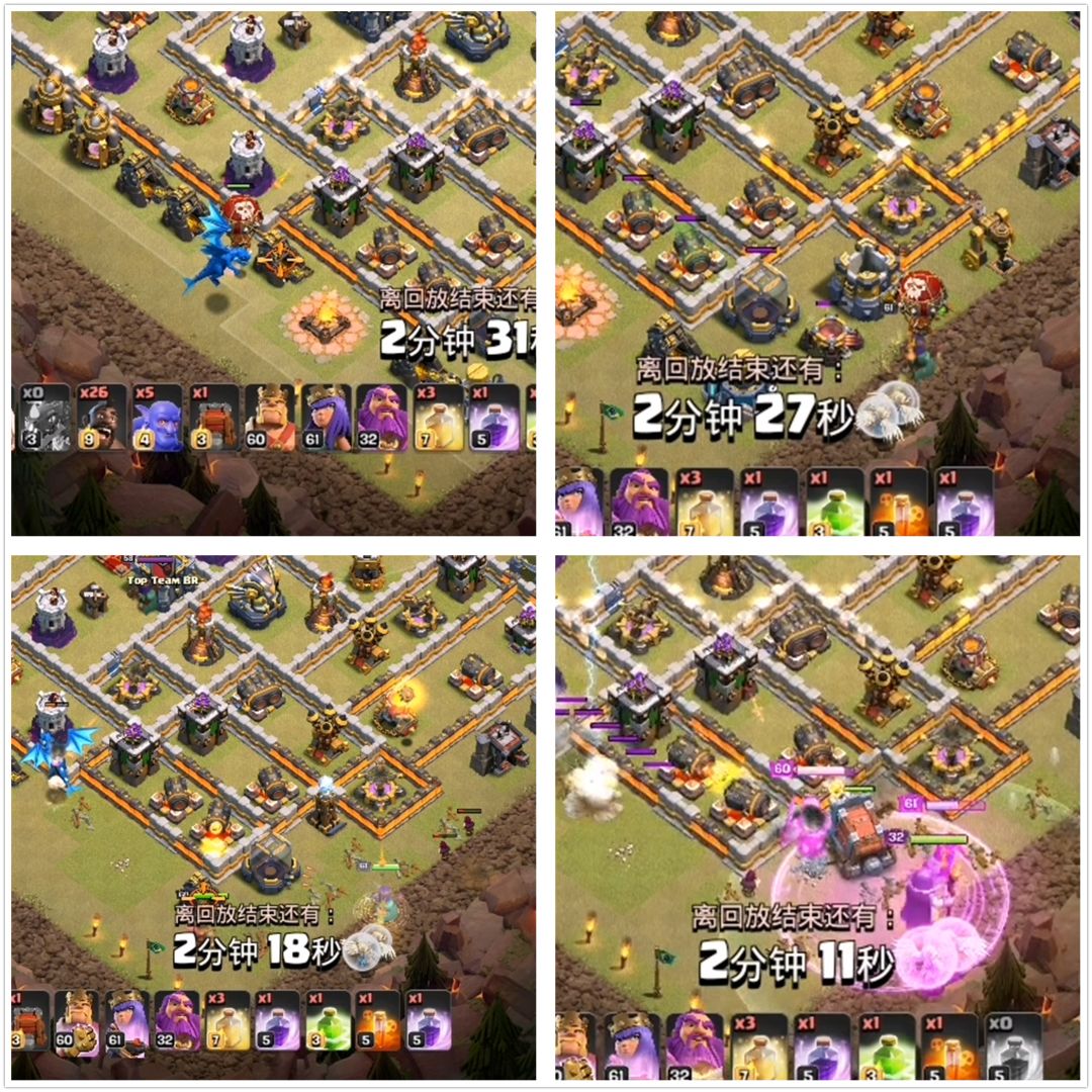 这里带冰人是明智的选择,冰人血量不低,且死后会冰冻一大片建筑,实属攻城兵种的第一人选。然后蓝胖带了5个可在前期拿来爆建筑,而气球则为天使和雷龙抵挡伤害。法术方面带3个治疗法术是最低配置了。