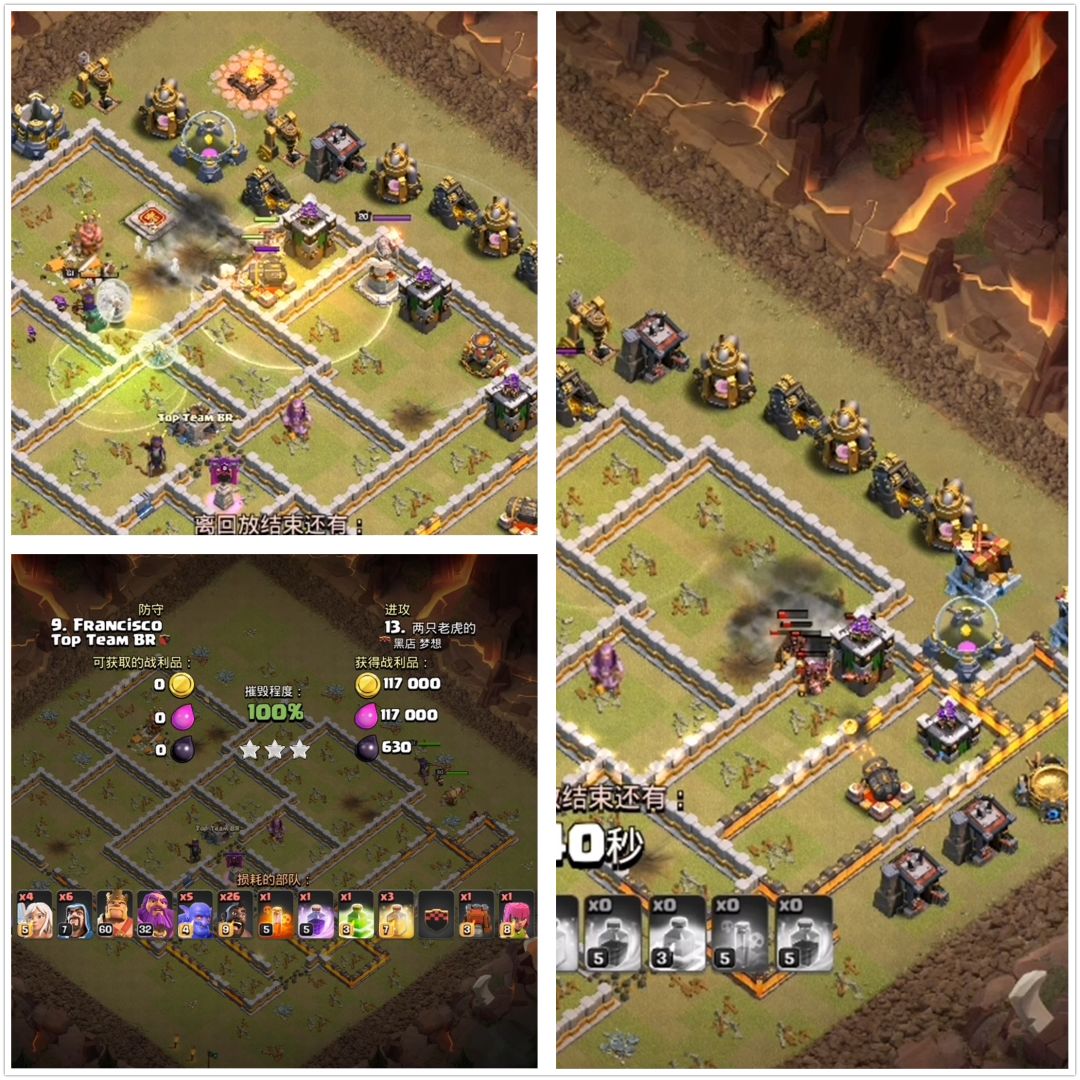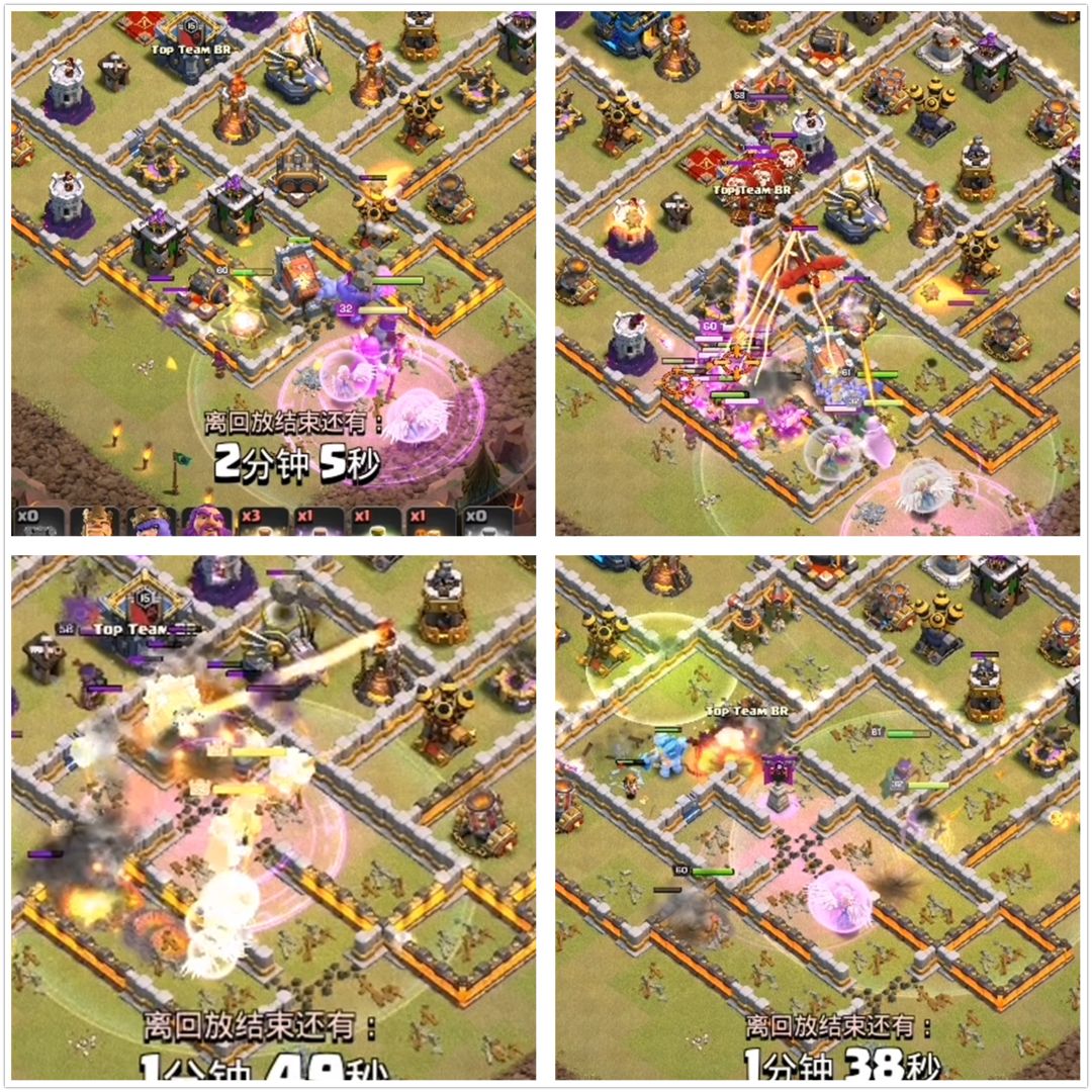 一路都靠战车拆墙就行,弹跳法术是随机应变用的,这里我们的天使没有偏离目标,一直给女王加血,这是一个非常好的开端,要知道女王能多存活一会就有非常大的三星几率。