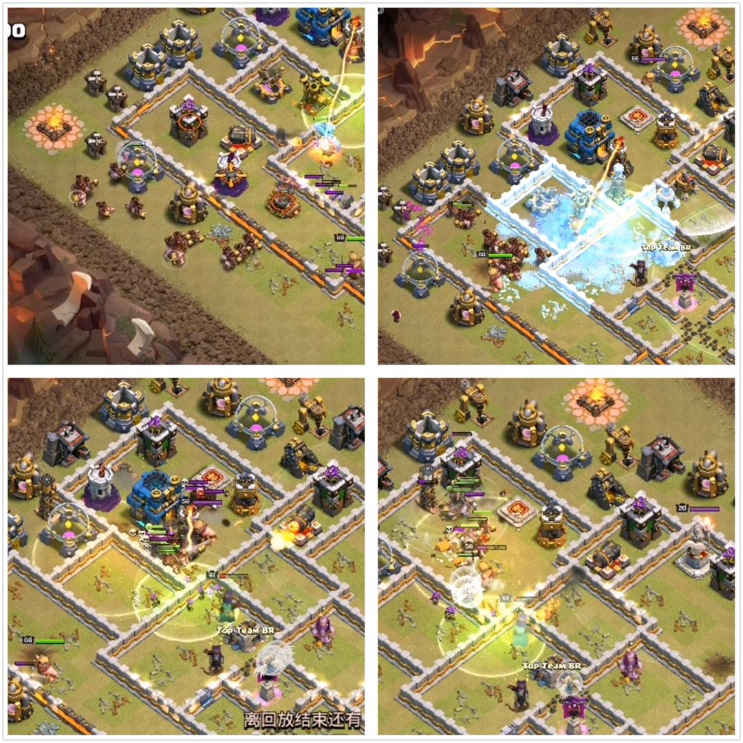 前戏差不多了,就从9点方向下野猪即可,此时弹跳法术和冰人的效果显现出来了,几秒的冰冻为野猪部队提供了良好的生存环境。而且女王也走到中圈,天使转头给野猪治疗。这就相当于又带了一个治疗法术。最后一波,我们虽然踩了双炸,但是这些野猪部队仍旧拆完了最后3个防御,完美收官。