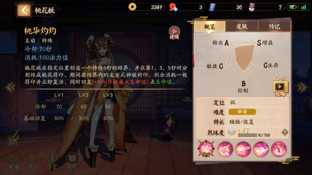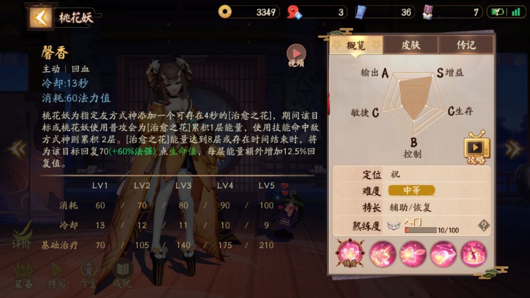 桃花释放技能消耗一朵桃花,为自身和附近血量最少的式神回复生命。每隔一段时间获得桃花。时间分别会在6/11/16级衰减。