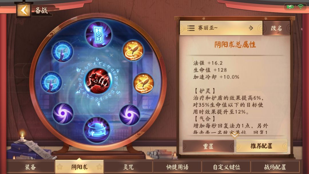 前面也说啦,【法强】越高恢复越高。【冷却】减少技能CD,能更多的释放一技能回血。由于桃桃身板较脆,【生命】可以提高一点坦度。桃花的恢复全都吃【护灵】加成!【气合】则让桃桃线上有续航(蓝条)能力。带【秘术·豹袭】提高线上消耗能力。当然了,换成【秘术·炼狱】也是可以的。对自己或者AD不自信的也可以换成【言灵·守】再次提供一层保护。