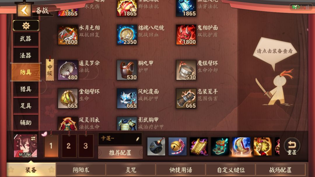 (懒得剪了!) 酌情参考哦。我提供一下思路吧。桃花妖出法装的收益是比防具要高很多的,因此我才会考虑【轻音】【曼荼罗密经】【出云之章】等装备来提高法强。最后补上一两件防具即可。