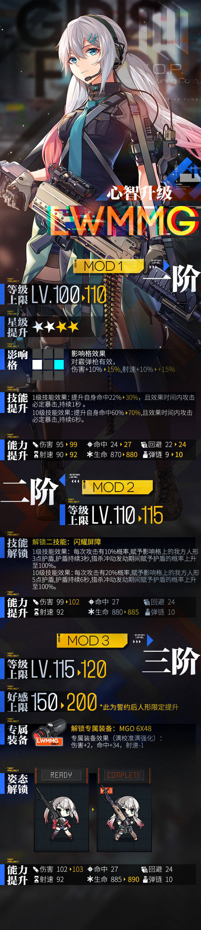 亲爱的指挥官们,现在为大家介绍的是LWMMG心智升级后的全新姿态!在心智升级后,四星级别的她将获得影响格、一技能以及角色能力的各项提升,而她的二技能则是给了她援护队友的能力。在战场上,这可能有意想不到的妙用!详情请查看下图! (我忘了,罪过罪过,自罚跪搓衣板一小时)