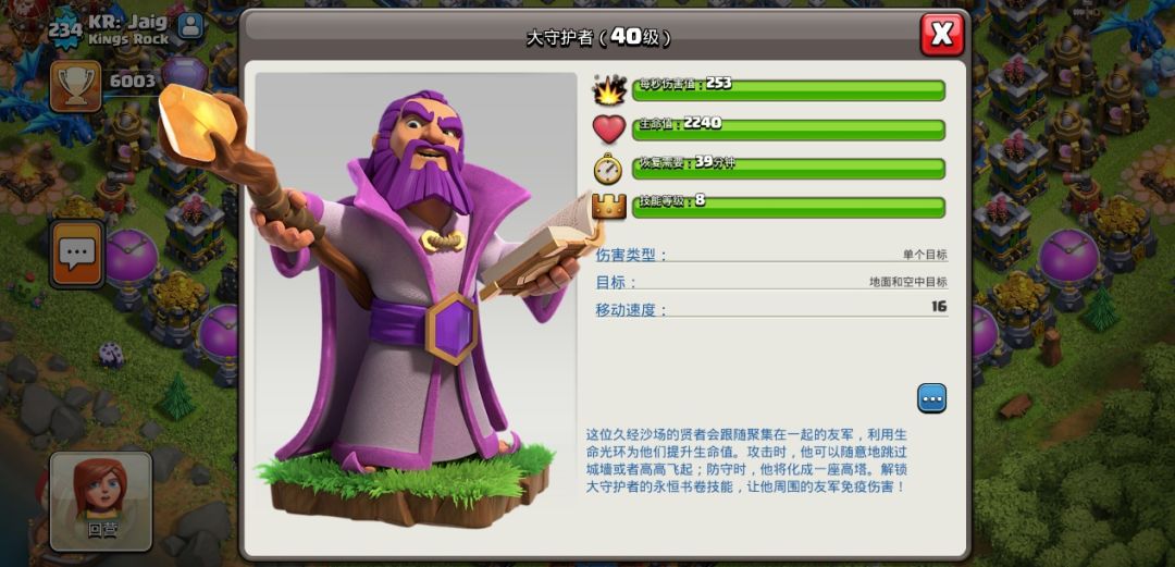 当到达十一本时,我们可以解锁大守护者,他是家乡世界三名英雄中唯一一位辅助类英雄,他能利用生命光环提升友军生命值,同时还具备双状态,可以高高飞起或随意地跳过城墙,时刻紧跟友军行进。他的技能是永恒书卷,能够提供短时间无敌效果,使技能覆盖下的部队不会受到任何伤害!