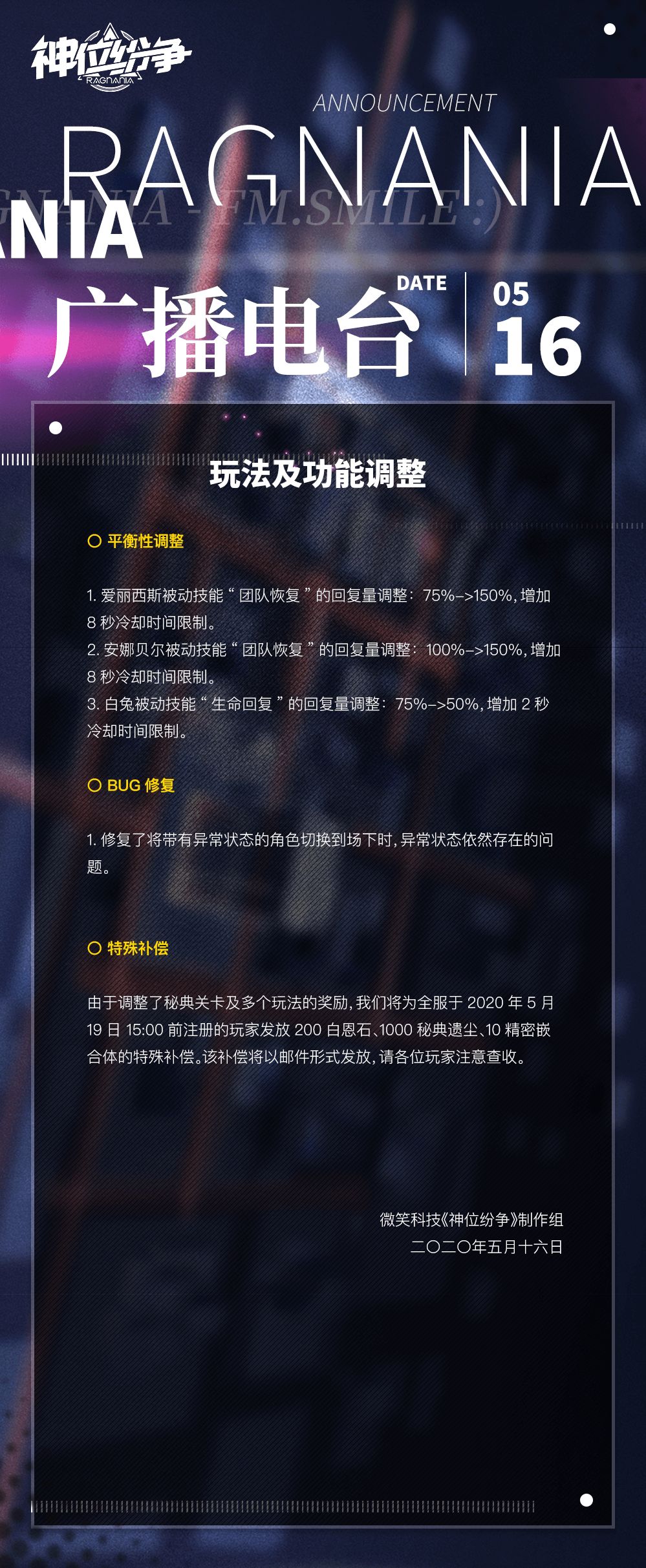 由于调整了秘典关卡及多个玩法的奖励,我们将为全服于2020.5.19 15:00前注册的玩家发放200白恩石,1000秘典遗尘,10精密嵌合体,该补偿将以邮件形式发放,请各位玩家注意查收。