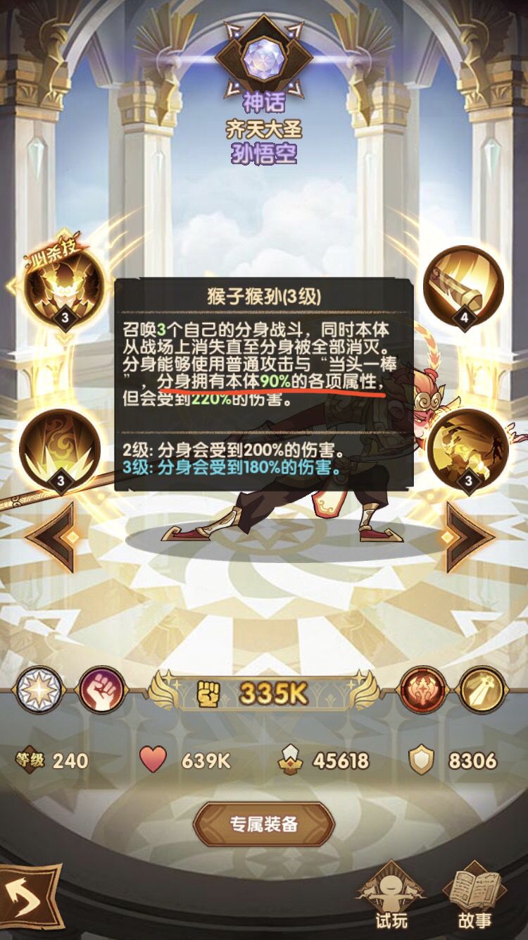发现猴子的大招描述是“分身拥有本体90%的各项属性”所以这里很可能就包括吸血了吸血属性