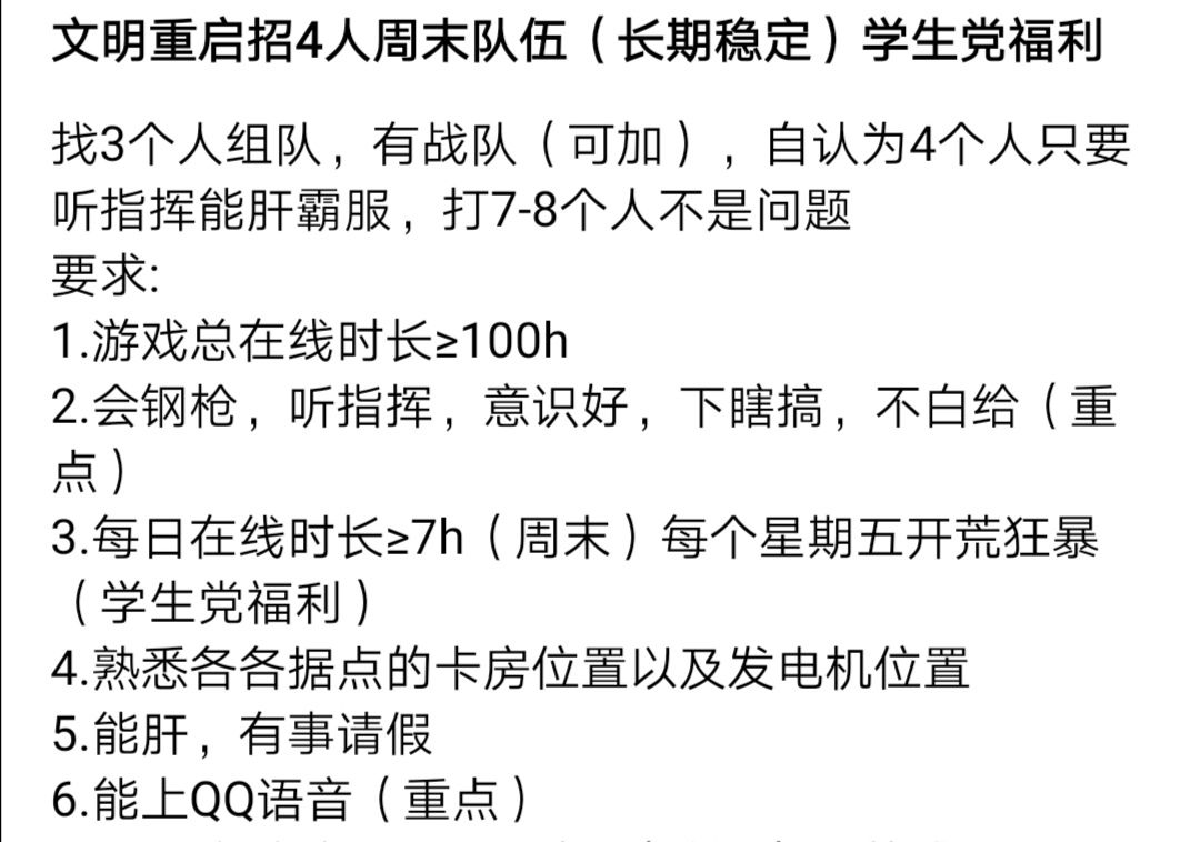 文明重启招收周末长期4人队伍(学生党福利)