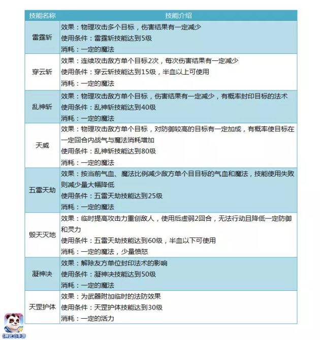天威:天威需要技能等级达到80才能使用,是一个附带debuff的破防技能。除了破防效果,还能一定回合使目标战气和魔法消耗额外增加,这个效果简直就不用多说:战气影响坐骑技能的释放,一个天威就可能化解掉对面1次有威胁的坐骑技能配合!同时天威对高防御目标附加一定的伤害,这也让天宫对于钢板也有一定的威胁。