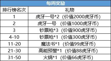 活动每周一结算,将以6月10日、6月17日、6月24日、7月1日下午14:00的游戏内榜单为依据,为榜单上前五十带“虎牙”前缀的主播发放奖励