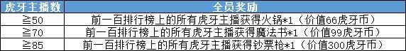 四、同舟共济奖活动期间,以每周一(即6月10日、6月17日、6月24日、7月1日)下午14:00的游戏内榜单为依据,根据虎牙主播在游戏内前一百排行榜上的数量将开启不同的全员奖励!