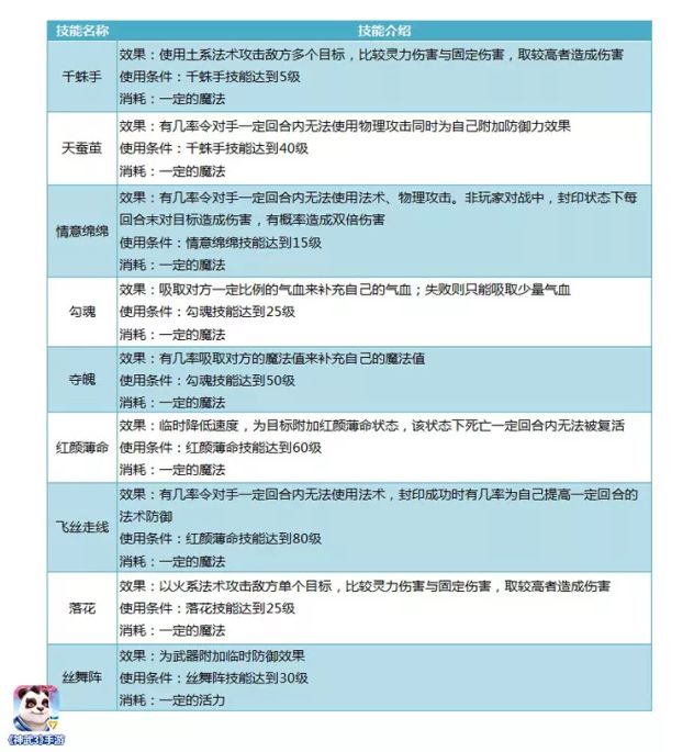 盘丝作为两大封系门派之一,也有着自己的特点:可以封人,可以吸血、可以吸蓝,还可以给对面来一发红颜薄命,让敌人长年躺地板。如果喜欢玩封系,相信盘丝也会是一个不错选择!