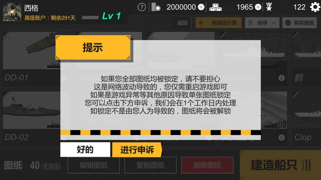 1.对于被锁定的船只,现在可以点击被锁定的船只进行申诉了。如设计图纸本身未利用BUG,且图纸中未包含您暂未获得的装饰物,同时您的账户当前状态可以正常完成此图纸时,图纸将会被解锁。该过程由人工检查,因此您需要等待最多一个工作日的时间。您仅可同时对一张图纸进行申诉。