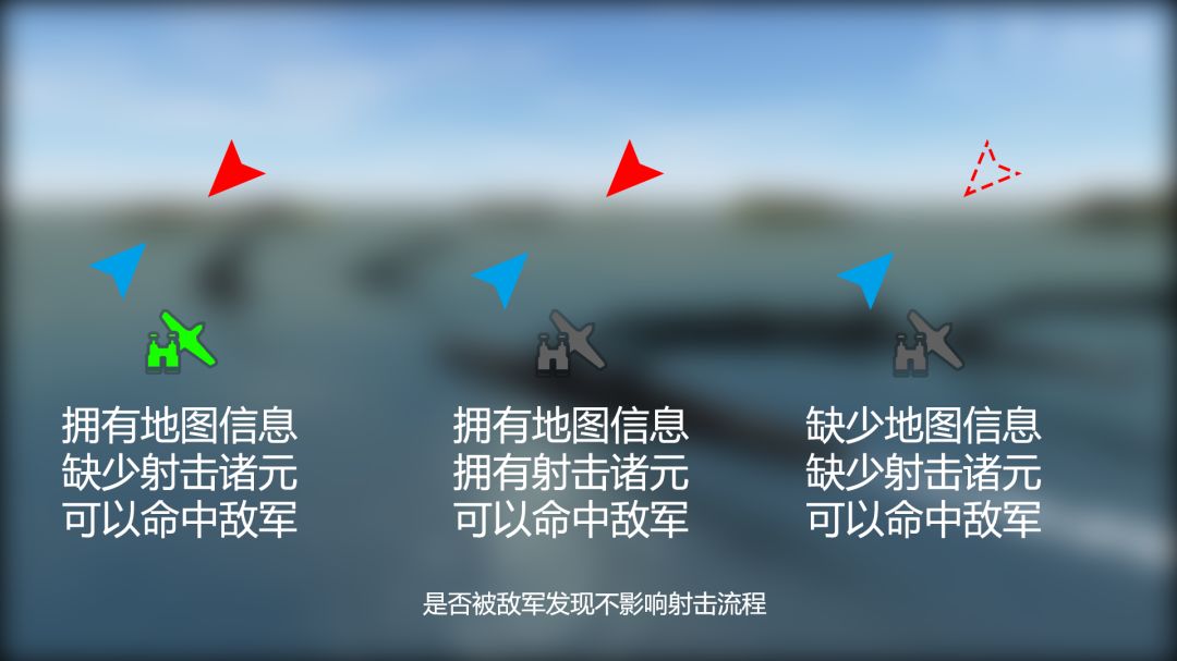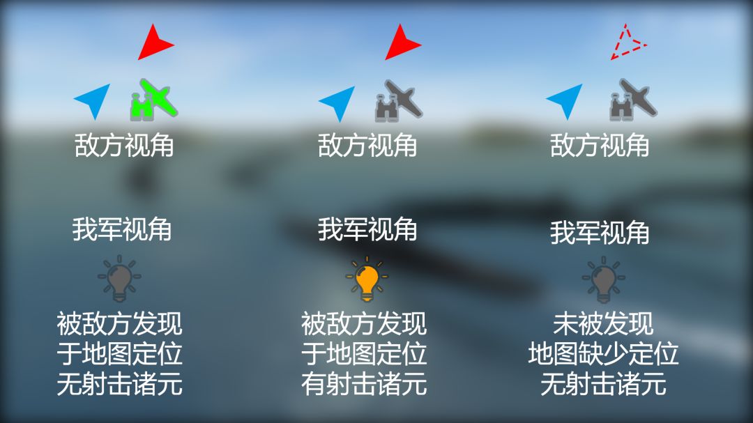 同时在多人对战时,视野外的敌军战舰将无法通过德梅里克计算器确定提前量,也无法使用鱼雷预描线,测距仪无法提供其距离,同时船只信息板将不再显示,小地图上也不会提示该战舰的方向及位置。