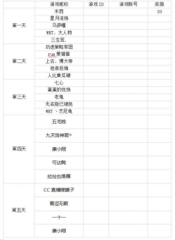 以上玩家每人将获得30的京东卡奖励,因为话费发放不便,将用30京东卡代替,尽请谅解,京东卡可以购买京东商城上的任意自营产品。请看到自己昵称的玩家,带上自己的ID、登陆账号向官方群中的群主领取相关奖励。