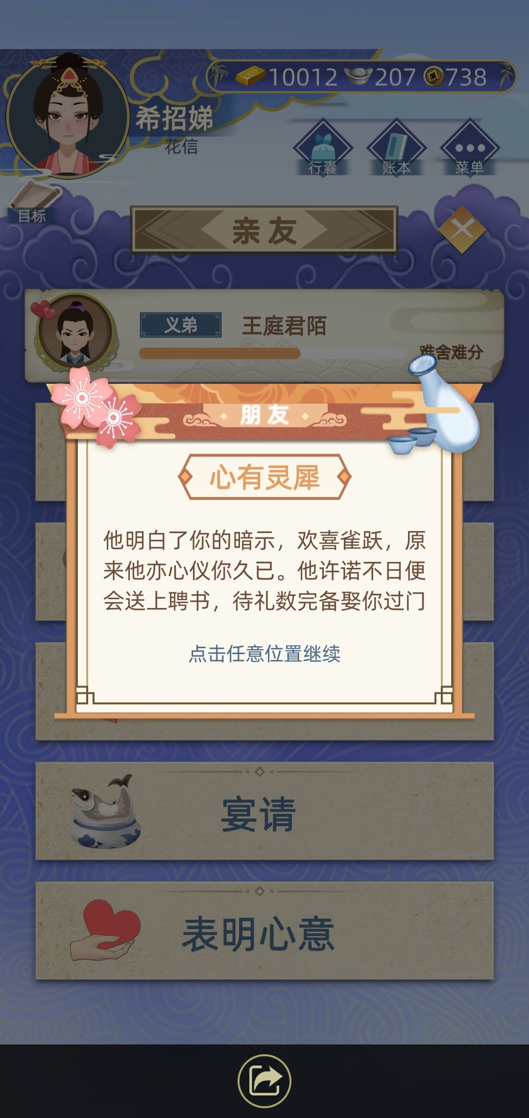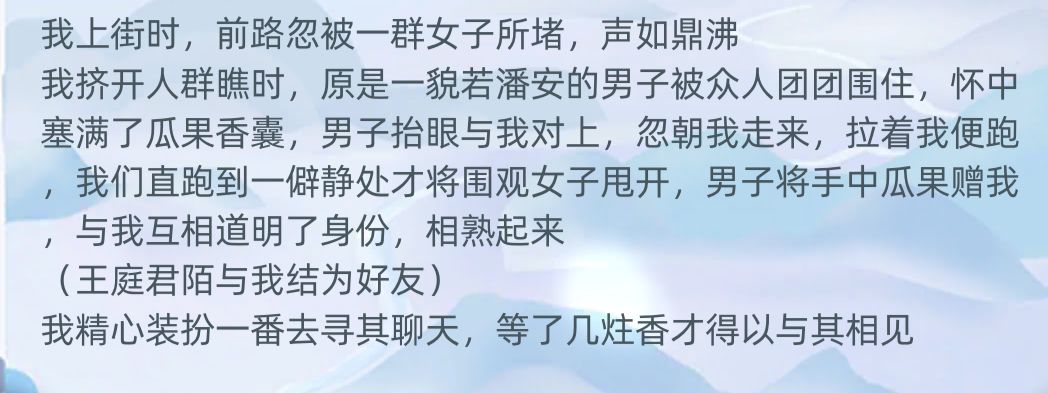 一上来直接给我情投意合,所以这是一见钟情?我想着可能要成功了,他这时候才14岁,还不能娶妻,我比他大五岁🌚然后我就继续刷好感。