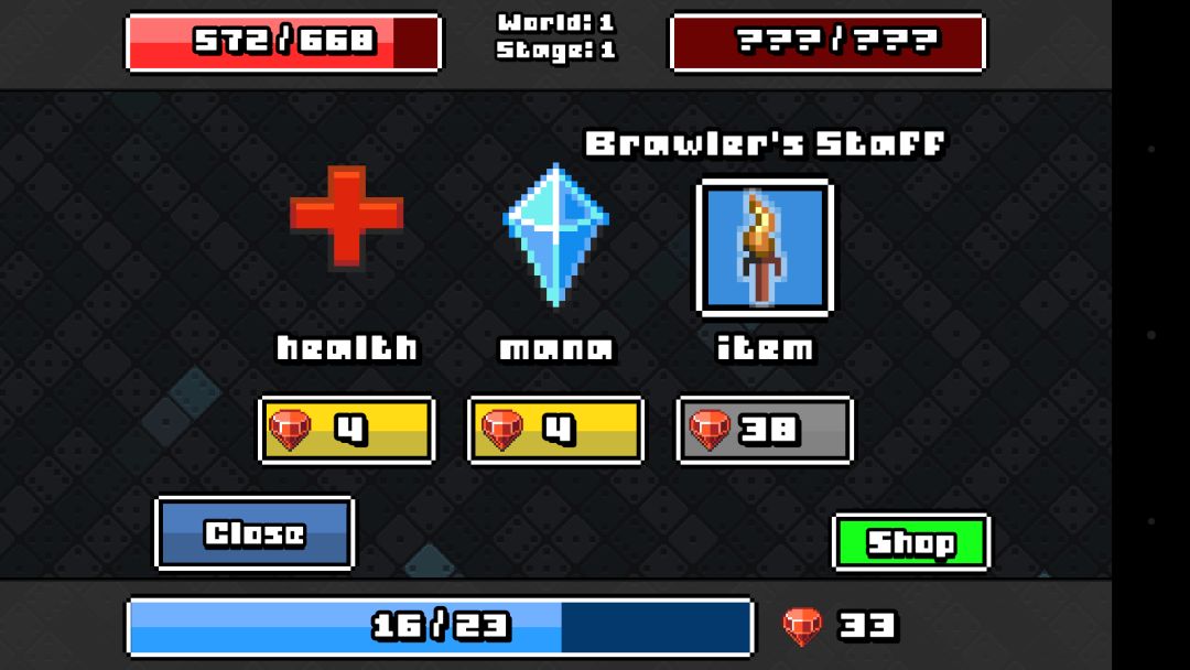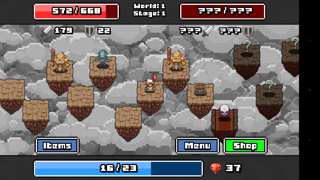 游戏进度在我看来就是横版的爬塔模式,地图上有很多怪物,商店,宝箱,Boss的地块,只有攻击解锁了前面的才会解锁后面的地块,每个图都至少两种怪,所以优先考虑打自己打的过的,这样才能保存实力打过没张图的关底Boss,打完十张图之后就会上升到另一个高难度世界,随着难度的提高怪物跟Boss的强度也会提升,当然宝箱出的装备属性也会跟着提升!