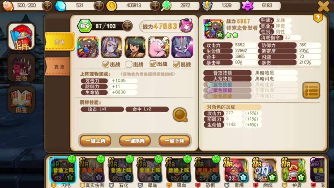 在出战设置中,把其中一只宠物下面出战的√关闭,这样战斗时,这只宠物不能攻击,也不会被攻击到,但是可以释放技能。当其他所有都被控时,此时不出战的宠物一个技能,就完事儿了。如图,其他宠物和角色都被控制了,没出选择出战的阿努比斯可以自由释放技能。简单吧?没想到吗?居然还有这种操作?