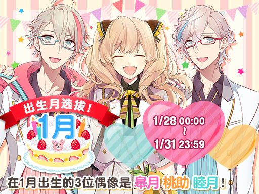 诞生月主题选拔共分为【皋月】【桃助】【睦月】【综合】四弹,每一弹提升的活动限定偶像卡牌不同~