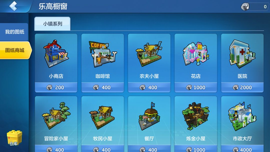 生存模式的右上角,可以看到“乐高图纸”的选项,点击小镇系列选项卡,就能看到很多预置的图纸,选择心仪的建筑购买,就可以把图纸建筑直接建设到地图中!