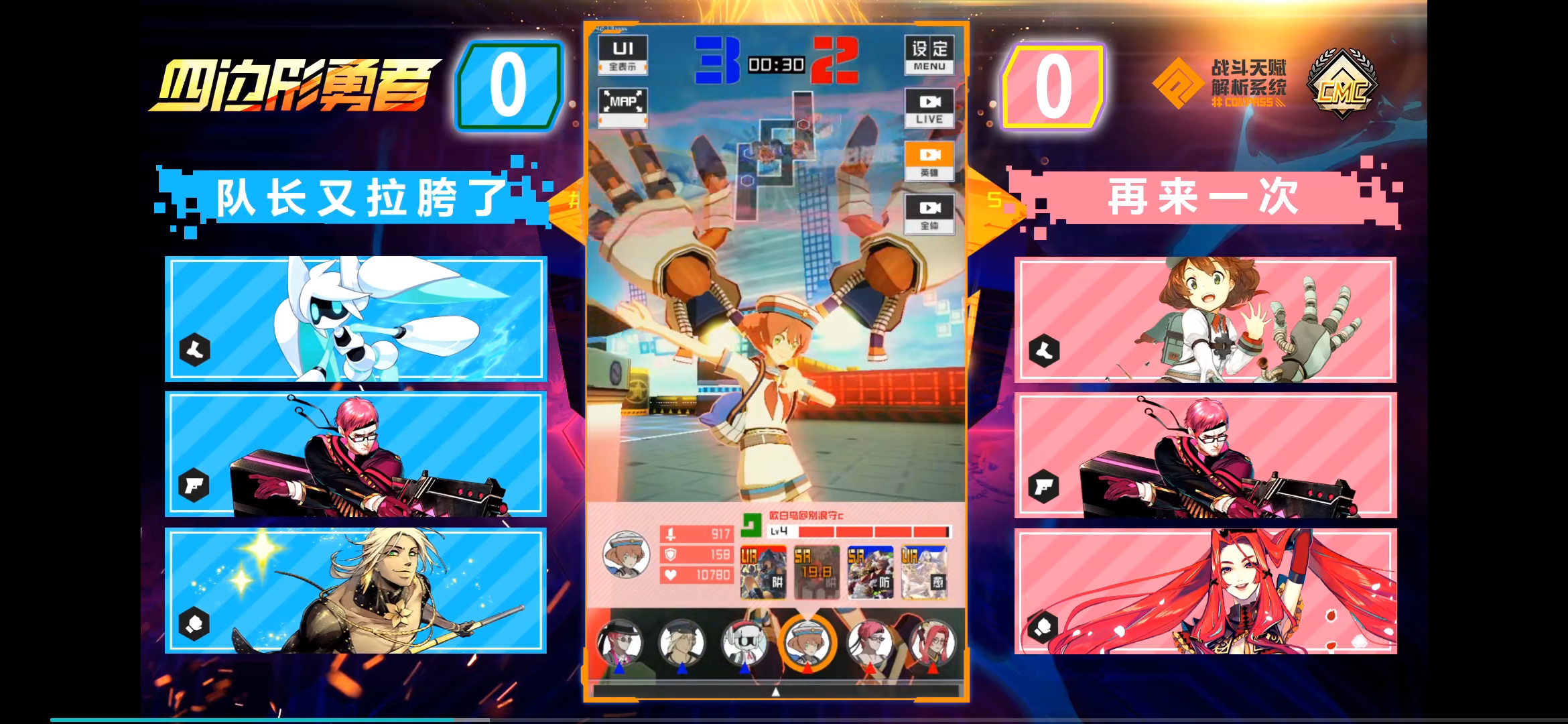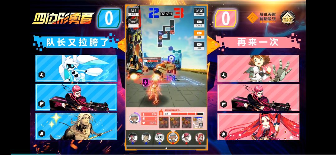 阵容上双方都选择了移速较慢,擅长远距离技能且必杀强力的枪叔,蓝队选择了非常灵活的辅助跑职小v,配合返场能力很强的近战角色波罗罗乔。红队则选用了善于利用陷阱和必杀分割战场,辅助队友的特斯拉,以及移速较慢,但近距离可以打出高伤害的近战角色玛利亚。