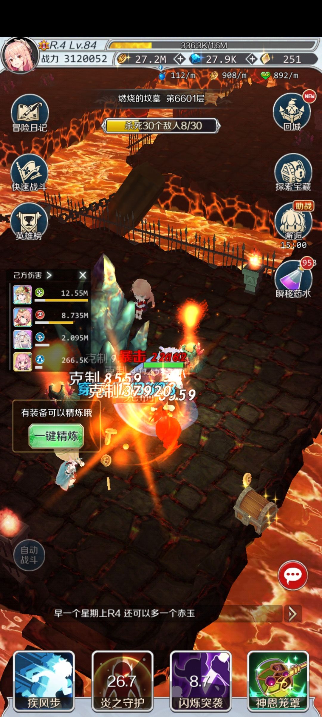 6.关于资源养成:①每天主城任务尽量刷宝石,B级以上领取双倍宝石袋;②主图右下角市场内,金币资源优先购买经验药水、元素精华,中期以后钻石的元素精华也建议买(不是商店里100钻的元素精华);③万事屋内,遗漏的快速战斗建议阶段毕业后使用(比如R3 1400层了,还没300级,再用);④万事屋内,有魂卡置换功能,每周首次免费,可以置换缺少的狗粮;⑤主图正下方商店里钻石的货品大多性价比低,除非急需或氪佬,不建议购买;⑥恒晶时装建议在抽齐第一个恒晶英雄池(限定池10个)后再购买,时装属性购买即生效,与爬楼成就送的时装不冲突,所以从长远来看可入;⑦自选卡请一定选恒晶英雄!!!⑧进入R4后,决斗商店每周一个赤玉请务必买满,有多余决斗币请买彩虹石,等到R4升金武具金+武具有大用处。