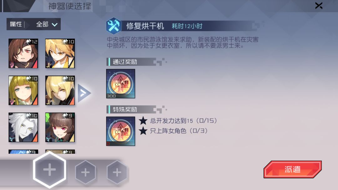 前三篇的开发任务是不需要自己动手打,但是要派遣神器使挂时间,挂时间会占用该神器使,使其不能在其他任务被重复派遣。同时必须满3个才能派遣,少一个都不行。