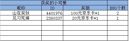 提交有效BUG的玩家:活动结束后抽取五名幸运玩家送出京东卡20元一张