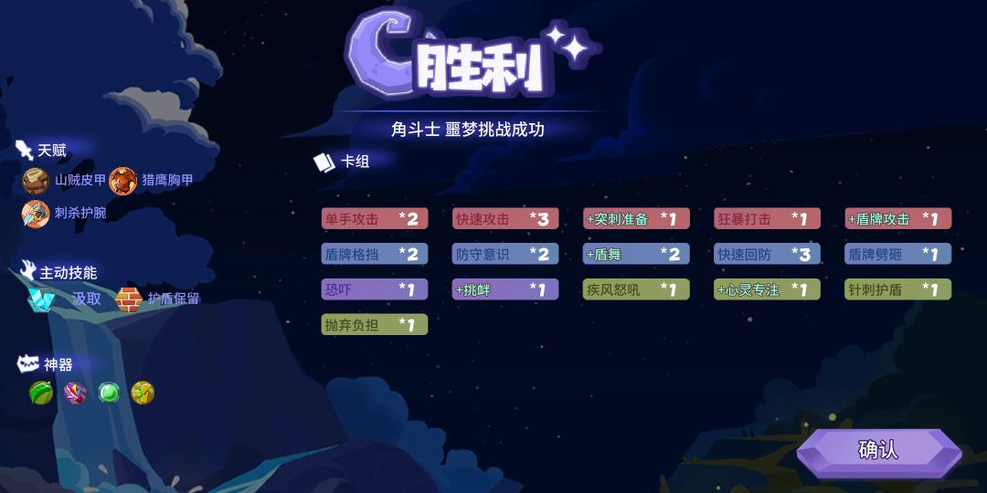 1.核心装备:山贼皮甲和猎鹰胸甲加盾!一回合结束免费盾10+稳稳通关保障。