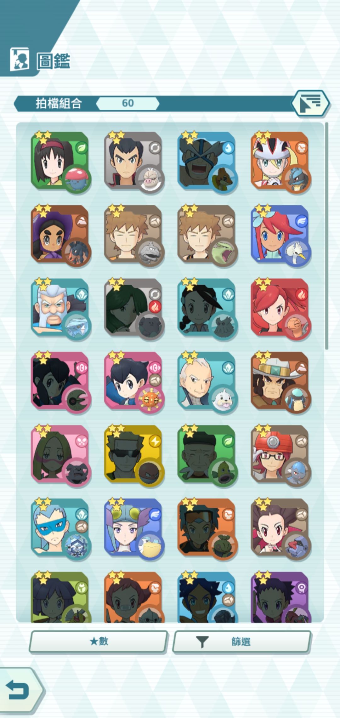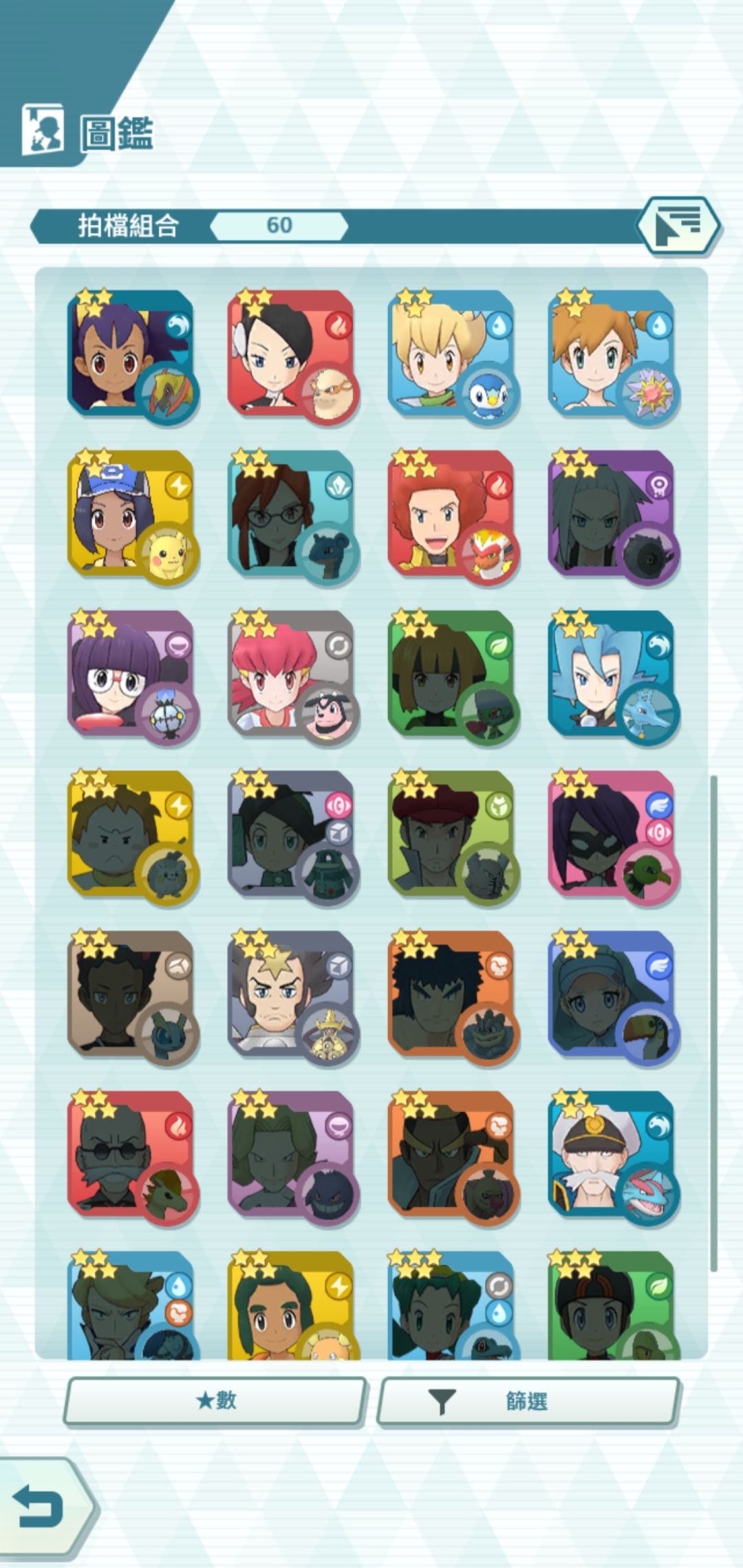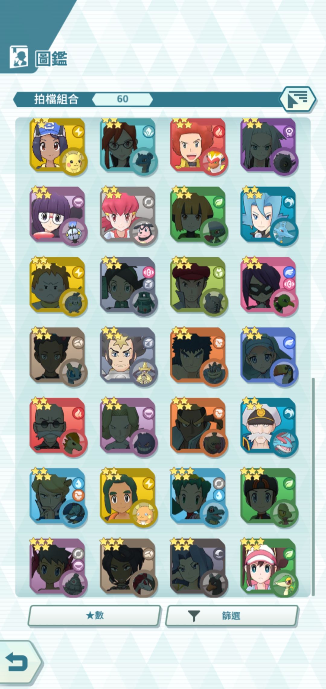 游戏目前提供了60 组 宝可梦+训练师的组合给你育成。