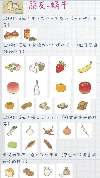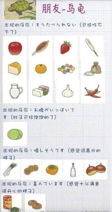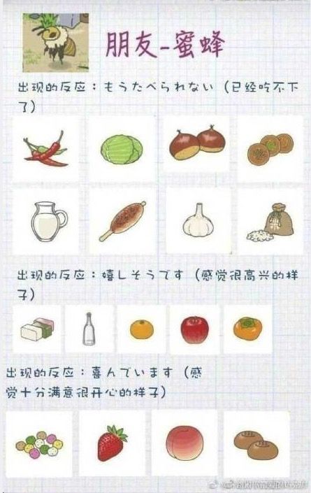 这里分别是蜗牛、蜜蜂、乌龟喜欢的东西以及各自的反应(附日文)