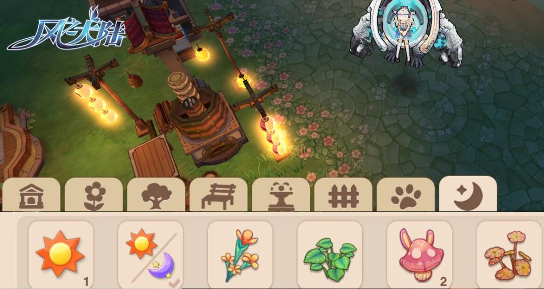 我们在“布置”里,选择“月亮”,就可看到夜景装扮的内容啦~无论是“荧光草”、“彩蘑菇”,亦或是“鲜花路灯”“萤火虫”,都可以给照亮我们夜间的风景,带来惊喜与浪漫。