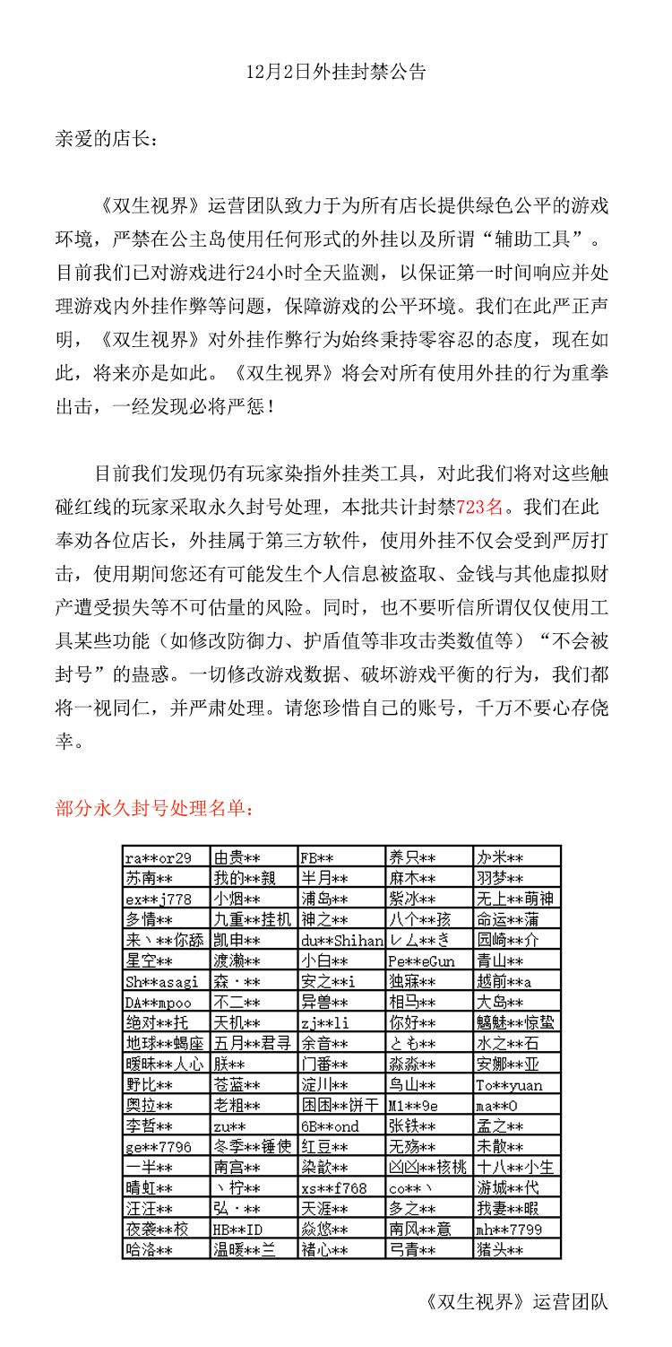 目前我们发现有玩家染指外挂类工具,这些玩家篡改游戏数据,破坏游戏平衡。对此我们将对触碰红线的玩家采取永久封号处理,本批共计封禁723名(为保护个人隐私,将对玩家昵称进行隐藏处理)。