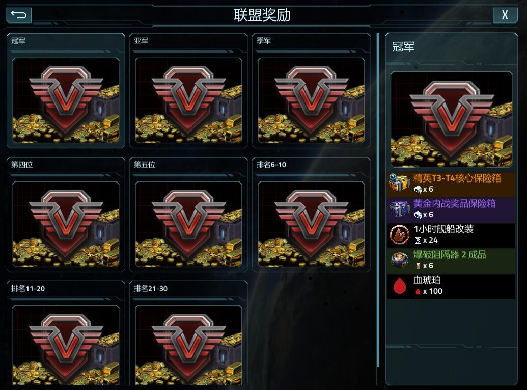 联盟奖励:冠军、亚军、季军、第四名、第五名、6-10名、11-20名、21-30名。
