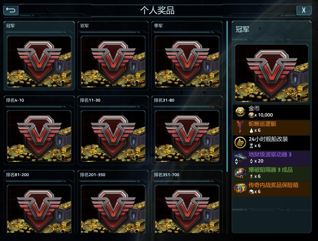 这次星区内战的奖励十分丰富,不仅有个人奖励:冠军、亚军、季军、4-10名、11-30名、31-80名、81-200名、201-350名、351-700名、701-2000名、2001-4000名。