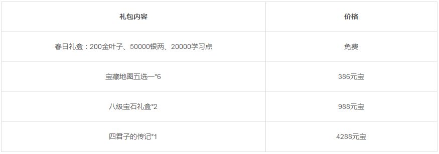 活动一:活动期间将限时上架春日礼包,礼包内容如下: