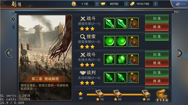 3、 武将进阶:在剧情关卡可以获得碎片材料,当集齐足够数量的材料时就可以为武将升阶:从白到绿再到蓝,品阶不断提升的同时,战力也在不断的增加。