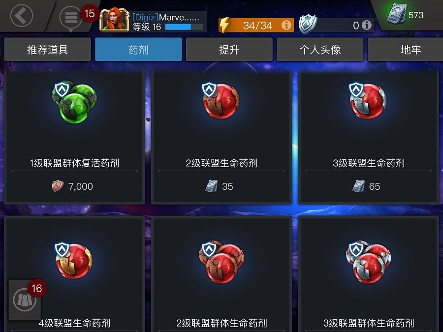 而在“提升”道具这一栏,我们能看到各种增强英雄战斗力的道具。加战斗力的药剂在前期一般不要购买,会造成星币的浪费,这一般都是在游戏大后期挑战很强力BOSS的时候才使用的。不过经验提升肯定是个好东西,能帮助你前期快速升级。