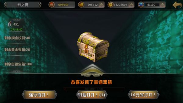 嘿嘿嘿!出现宝箱了,虽然只是一个青铜宝箱,但至少有点干货不是?不过,我两手空空,手中钥匙只有一把,实在是不舍得打开。转念一想,还是强行撬开划算。