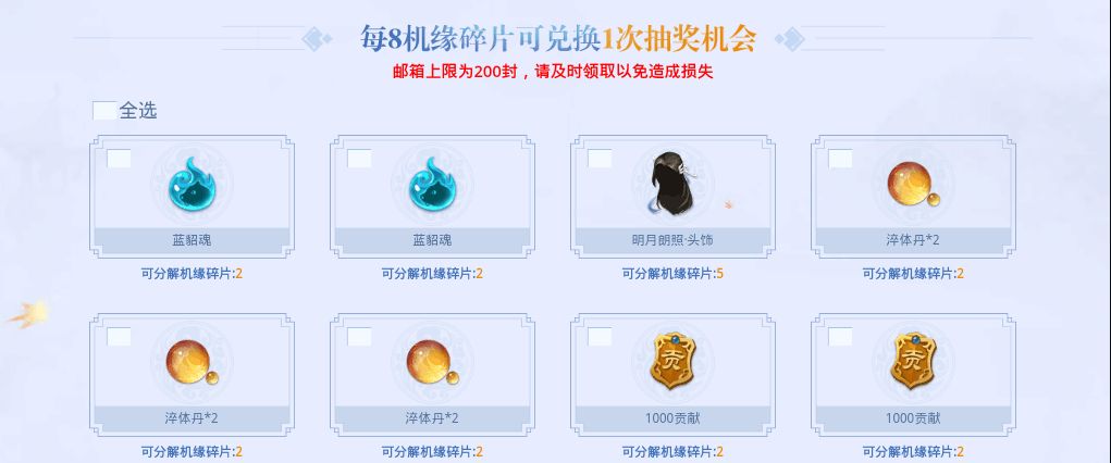 每件物品可分解成对应的机缘碎片,而8枚机缘碎片即可再免费抽奖一次。